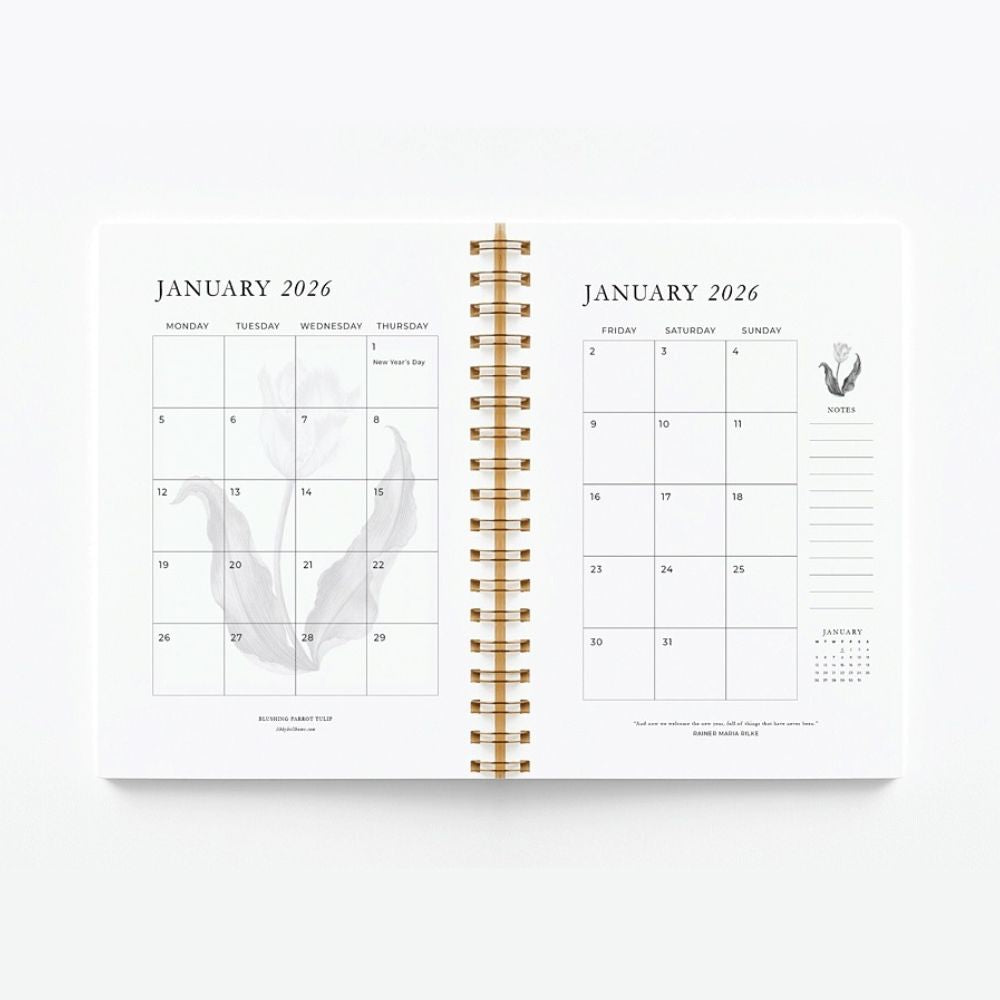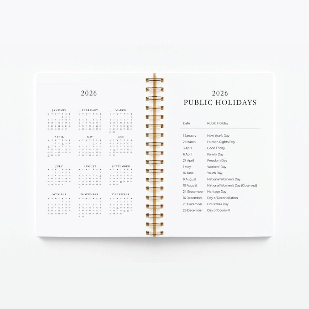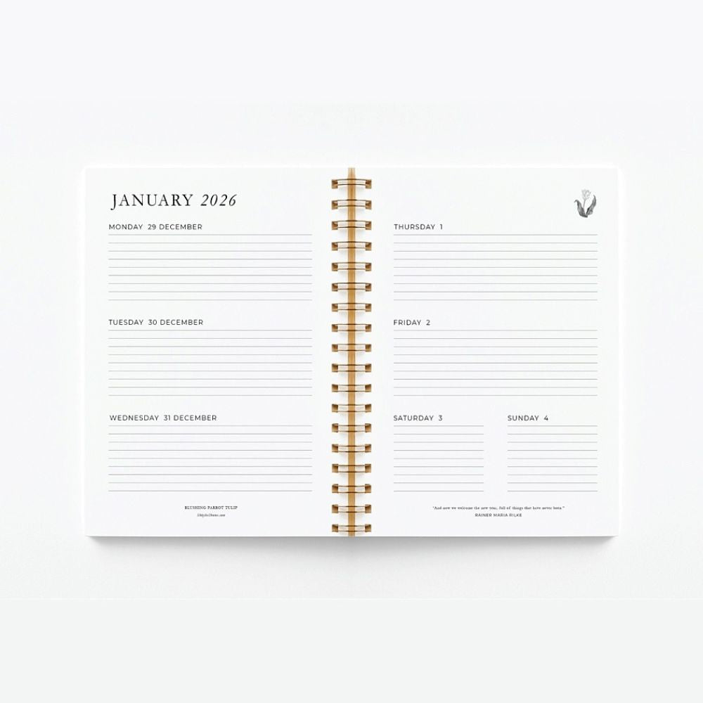 With a thoughtful week-view layout to keep you organised and inspired, the stunning cover features Libby’s classical botanical watercolour paintings overlaid with exquisite gold-foiled text and adds a touch of timeless artistry to your everyday planning.