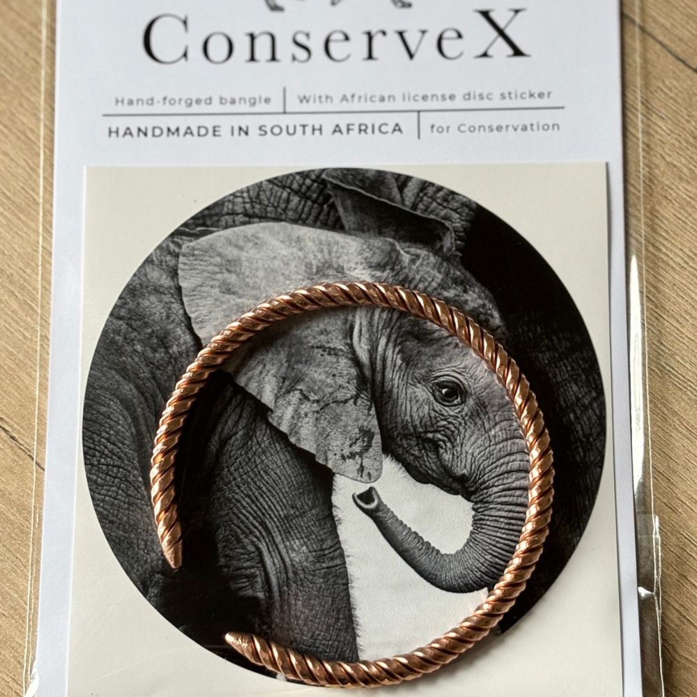 This hand-forged copper bangle, made by ConserveX, is a beautiful symbol of resilience and hope for African wildlife. Crafted from materials recovered from snares removed in wildlife areas of Mpumalanga, each bangle tells a story of survival and conservation.